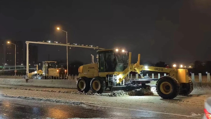 徐工平地機加滿油箱,列隊集合、整裝待發,全力以赴投入到破冰除雪,為道路暢通和行車安全保駕護航。徐工的機手們更是發揮了徐工人無畏艱苦、敢于奉獻的精神,以高度的責任感和使命感,堅守在除雪一線,保障市民的安全出行。冰雪紛飛的夜幕下,徐工平地機的燈光照亮了歸家人的路。