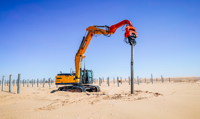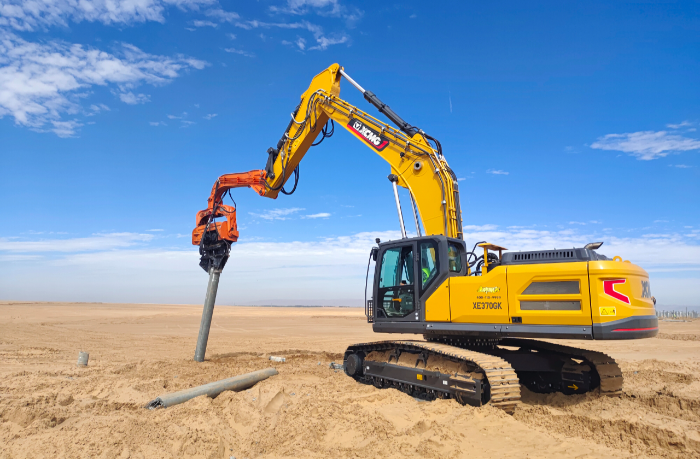 此次徐工挖掘機參建的巴彥淖爾100萬千瓦光儲+生態治理項目位于內蒙古西部,是自治區年度重點工程,對當地資源開發和綠色發展具有重要意義。 與以往常規項目不同,此次徐工挖掘機主要擔任光伏樁的鋪設工作,通過改裝振動錘和引孔機等多功能屬具,有效滿足現場多元化施工需求。