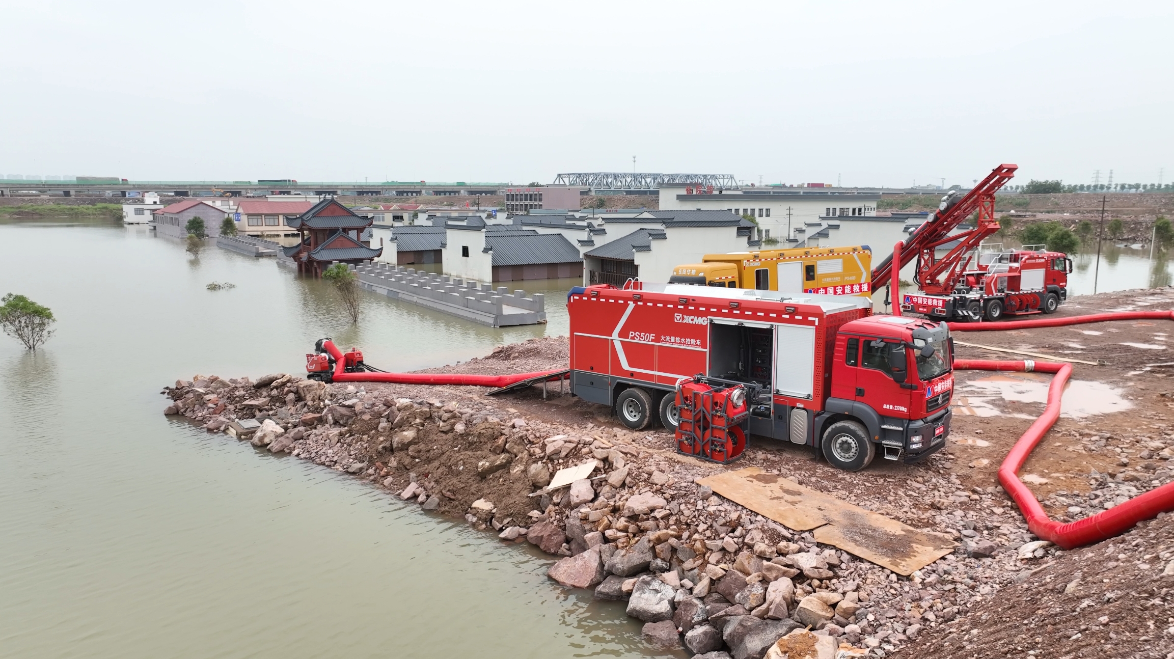 在各類洪澇災害搶險救援中“身經百戰”的徐工PS50F子母式排水搶險車、GP35C垂直排水搶險車、PS40B泵組式排水搶險車聯合應戰,充分參與排水搶險項目演練。