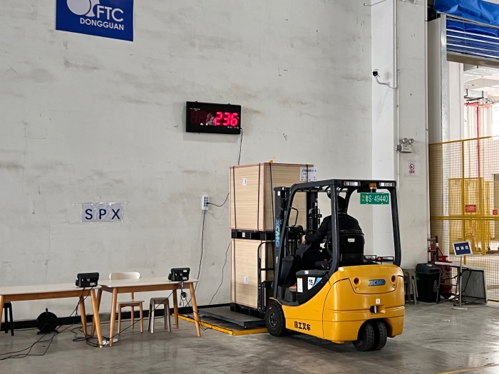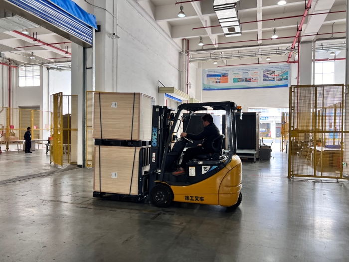 在華南區(qū)某大型保稅倉內(nèi),十幾臺徐工三支點(diǎn)系列叉車正在進(jìn)行緊張的搬運(yùn)工作,