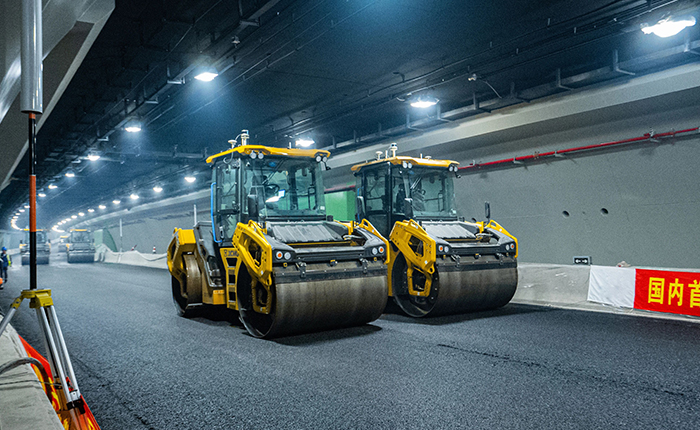 此次隧道路面鋪設(shè)工藝,是國內(nèi)首次在城市低空長隧道中進行無人攤鋪、壓實新工藝應用。鋪筑后路面密實度達99.9%,平整度比傳統(tǒng)提升20%,滲水構(gòu)造深度達100%。