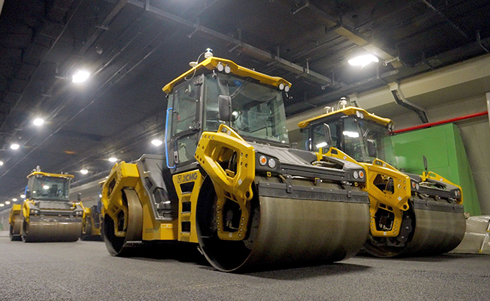 全線由徐工攤鋪機RP1005、RP805IV進行雙機聯(lián)鋪,攤鋪寬度9-11.5m、瀝青上面層攤鋪厚度100px,并由XD135TIV雙鋼輪壓路機進行壓實,在狹窄的作業(yè)空間內(nèi)展現(xiàn)出強大的施工能力。
