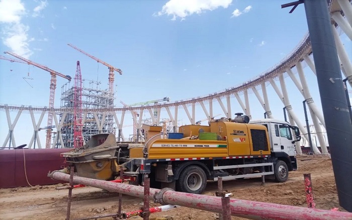 項(xiàng)目亮點(diǎn)之一的間冷塔,采用了創(chuàng)新的鋼管混凝土X柱結(jié)構(gòu),單柱高達(dá)30米,重達(dá)51.9噸。然而,隨著泵送高度的攀升,混凝土黏度急劇增加,泵送過程中極易出現(xiàn)憋壓熄火現(xiàn)象,對施工設(shè)備提出了前所未有的要求。