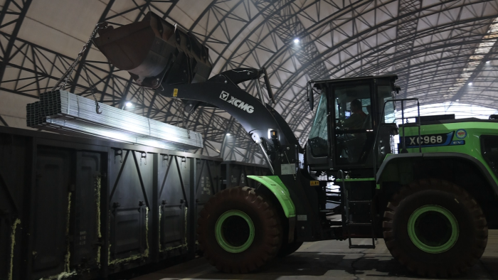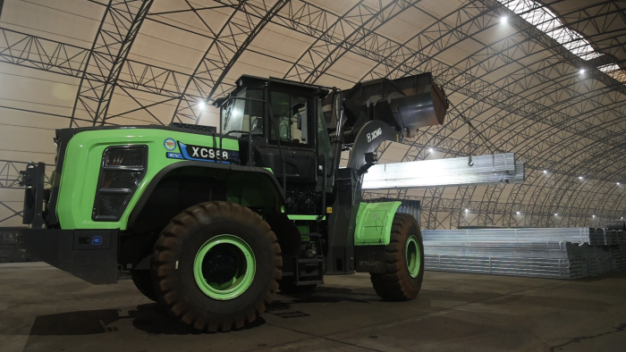 貨運站臺上,一臺綠甲戰士格外引人注目,這臺徐工XC968-EV純電動裝載機不同以往的圓弧型大臂像極了武俠小說中的“圓月彎刀”,格外引人注目。