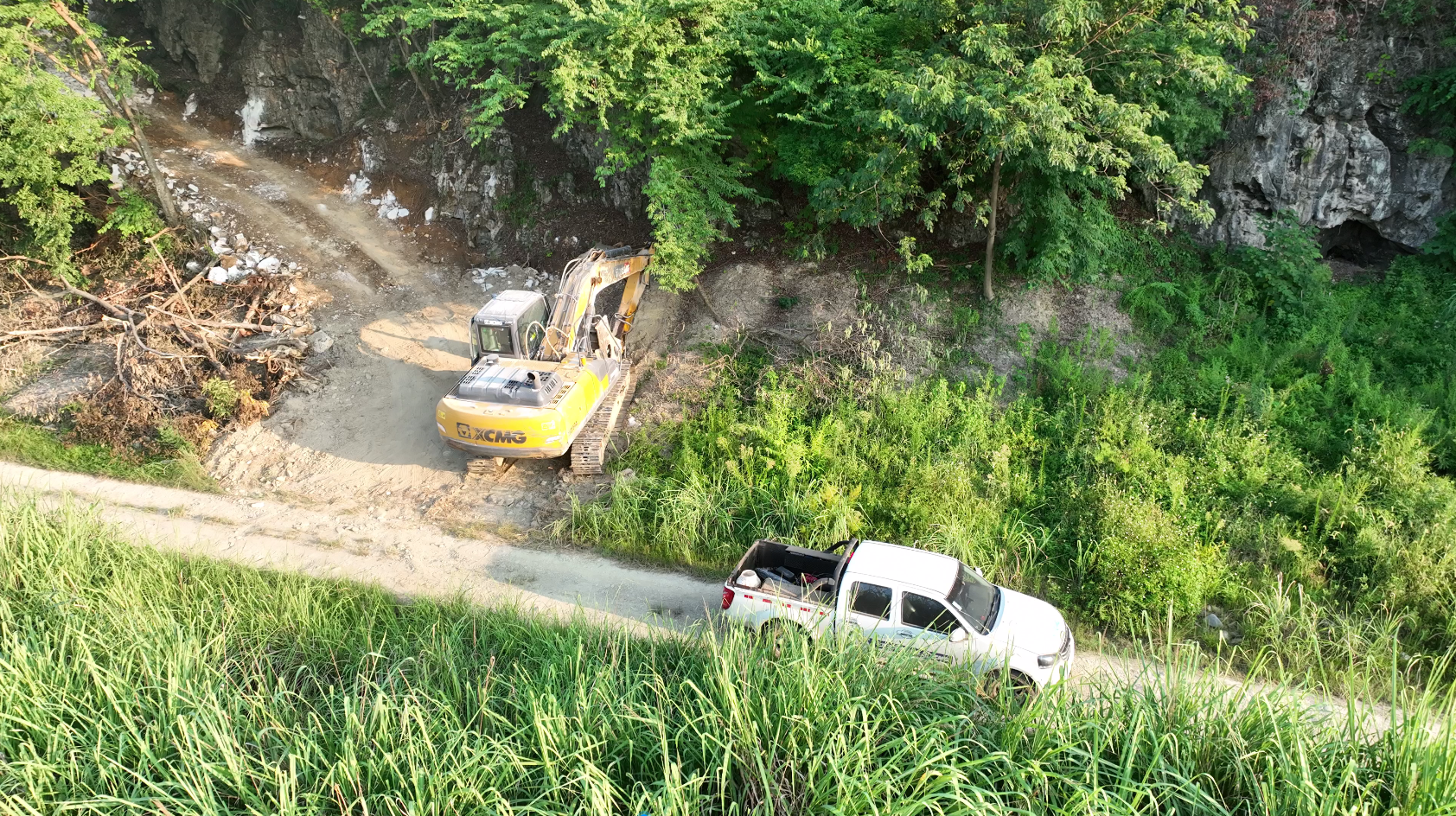 密不透風(fēng)的山林將正在作業(yè)的挖掘機(jī)完全擋住,只聽見破碎錘的聲音。