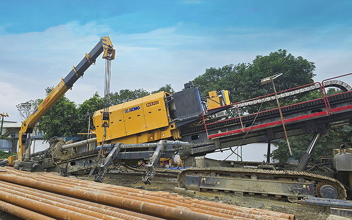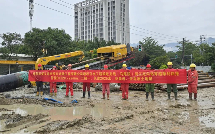 本次工程需穿越閩江,穿越距離長,地層條件復雜,淤泥與花崗巖交錯,施工難度系數大,此前,該項穿越工程因設備能力等原因停滯長達4年之久。施工過程中,徐工XZE8200起步回拖最大推拉力達到370t,最大扭矩90kN·m,全程高效施工,順利完成回拖,贏得了客戶和工程項目部的高度認可。