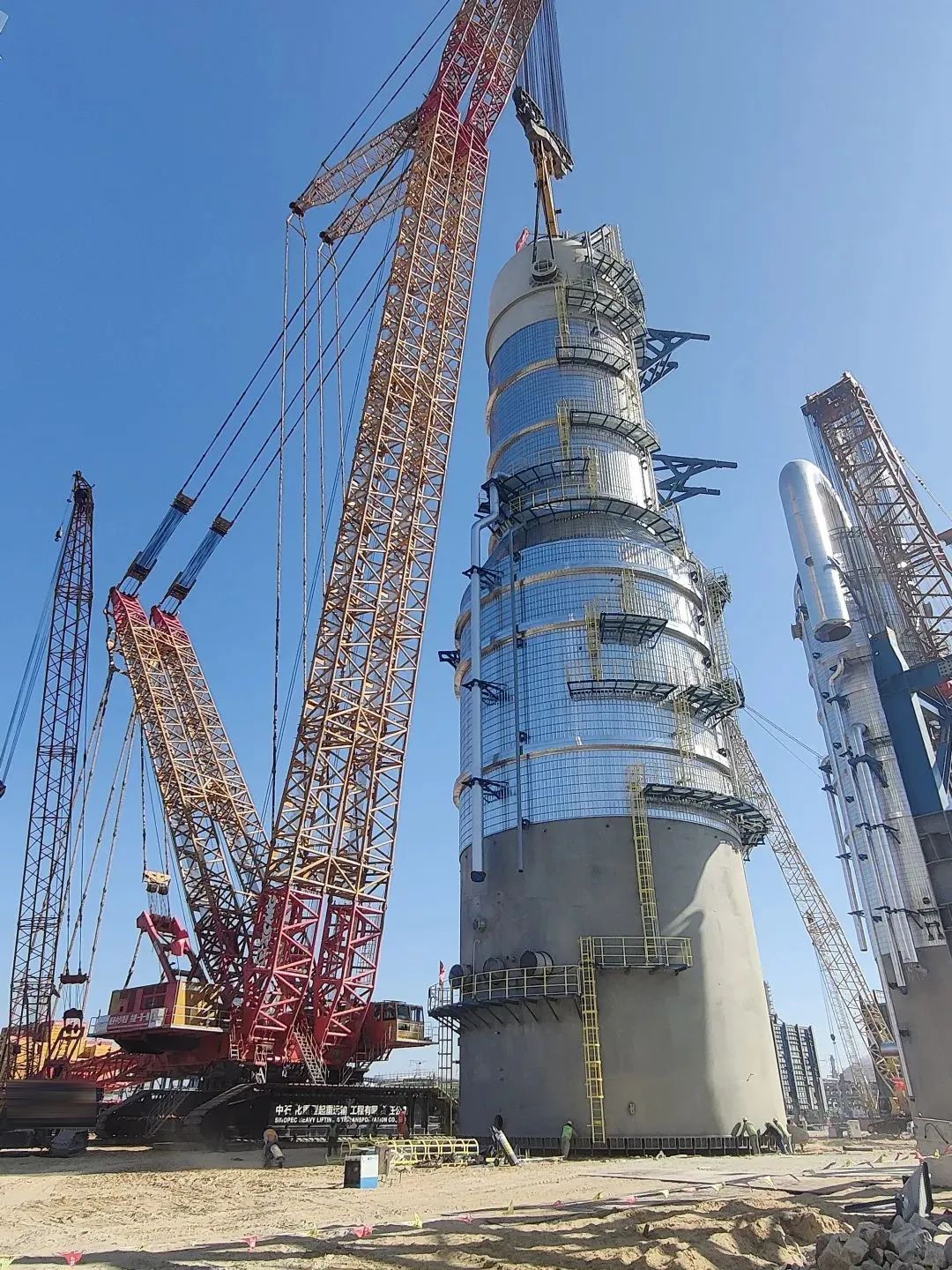 施工現場,XGC88000和XLC17000將“穿衣戴帽”后,總重量達2000噸的急冷水塔設備平穩吊起并準確放置到預定位置,全程行云流水、一氣呵成,僅僅耗時三小時