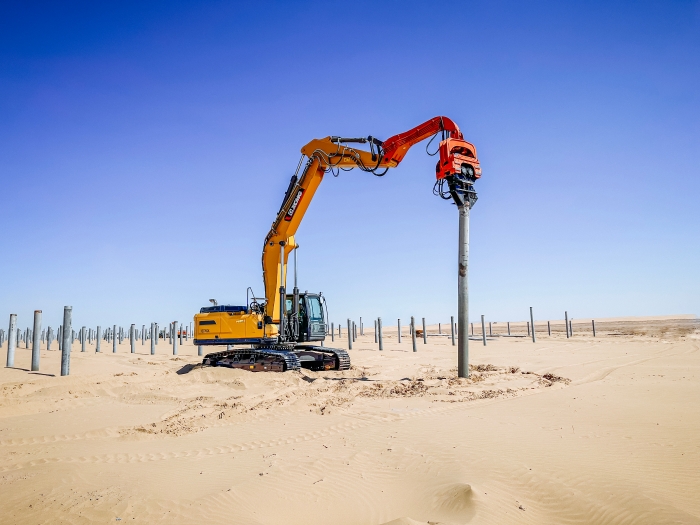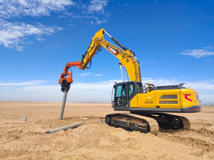 與以往常規項目不同,此次徐工挖掘機主要擔任光伏樁的鋪設工作,通過改裝振動錘和引孔機等多功能屬具,有效滿足現場多元化施工需求。