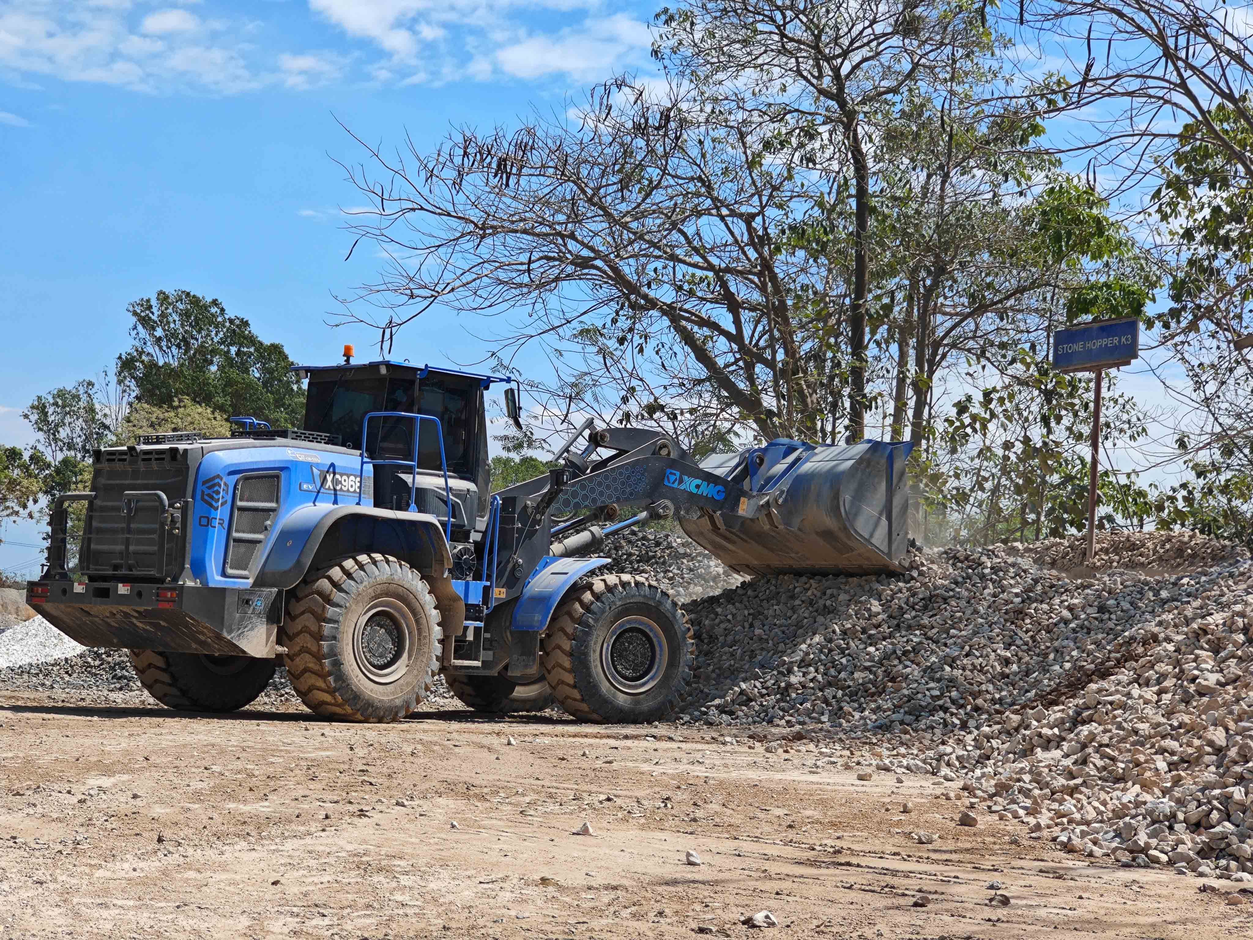 礦石從采掘面一斗又一斗連續不斷被送至周轉場,“青山綠”涂裝的徐工XC968-EV往返穿梭其間,形成一道綠色風景線,推動著當地礦山綠色化建設落地。