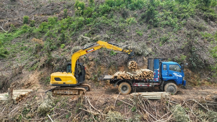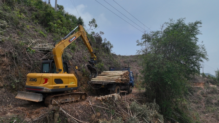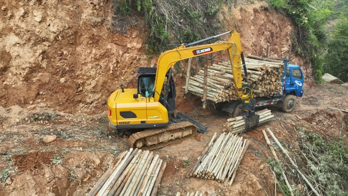 在鄭俊負(fù)責(zé)的林場(chǎng),每節(jié)木材長(zhǎng)度2.6米,徐工XE85GF一次可以夾10節(jié)以上的木材,重量超過1噸,而之前的輪挖夾裝0.6噸木材已是極限。