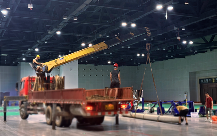 在廣西國際會展中心體育場館塑膠鋪設施工現場,徐工隨車起重機以硬核實力成為工程推進的 “主力軍”,贏得客戶連連稱贊。