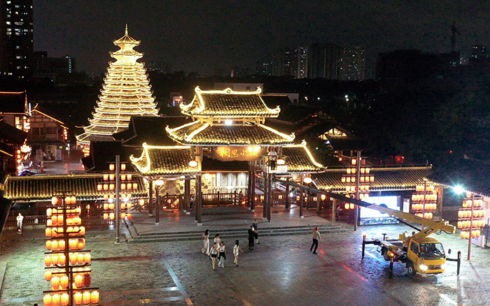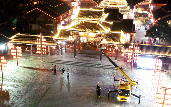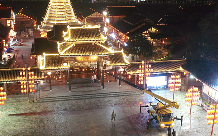 在以 “非遺傳承” 為定位的廣西某文旅小鎮亮化工程中,徐工 C 系列 GKS28 高空作業車憑借出色性能,成為施工關鍵力量。