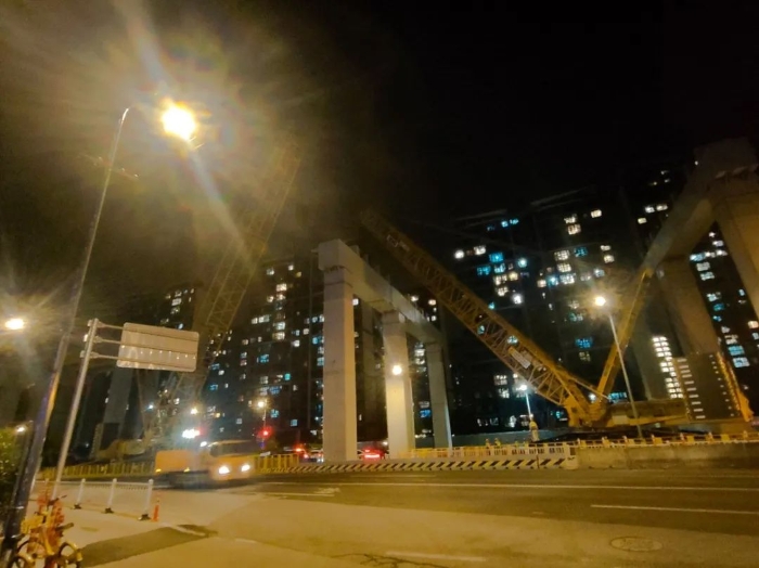 狹窄空間內(nèi),兩機(jī)協(xié)同微調(diào),在進(jìn)行精確轉(zhuǎn)場(chǎng)移動(dòng)的同時(shí),也避免了任何晃動(dòng)或扭轉(zhuǎn),重物分毫不差地平穩(wěn)落位至預(yù)定橋墩支座上,整個(gè)過(guò)程高效流暢,一氣呵成。