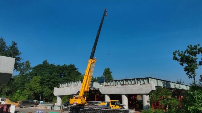 湖北通修高速公路建設現場,徐工G2代50噸新能源起重機正展露鋒芒。14米長、重達1噸的橋梁豎梁凌空而起,500斤橫梁于視野盲區精準對位——這是對起重機微動性與操控性的極限考驗。
