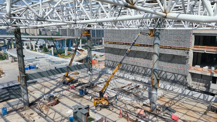以徐工XGS40K為代表的十余臺(tái)徐工高機(jī)有的“一枝獨(dú)秀”,平穩(wěn)變幅直指站房屋頂;有的精準(zhǔn)定位,靈活探入桁架之間緊貼焊接點(diǎn),成為保障鋼桁架高空焊接作業(yè)的主力軍,熱火朝天的為祖國(guó)交通樞紐建設(shè)貢獻(xiàn)力量。