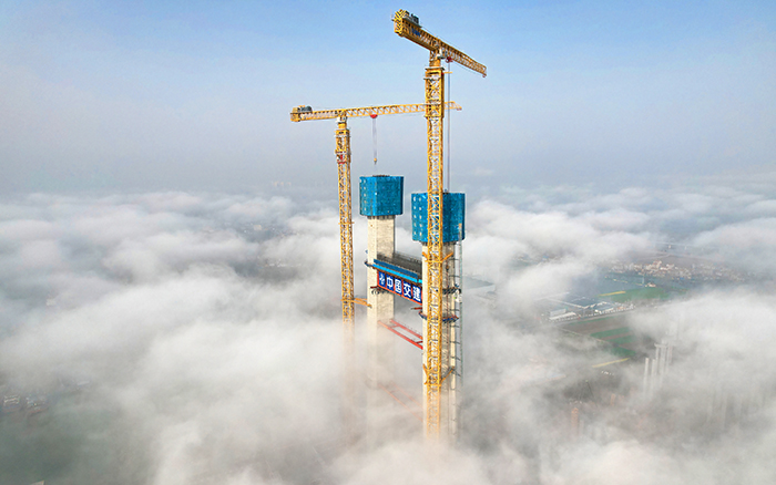 目前,兩臺徐工超大塔正在進行大橋北主塔第26節施工,主塔以平均每周6米的速度迅速“節節長高”,高度已達144.5米,高效的施工效率贏得客戶高度稱贊。