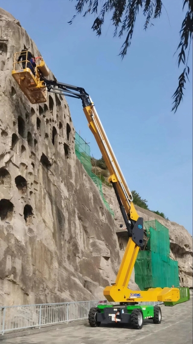 時間回溯到2021年,由于遭受多場暴雨侵襲,龍門石窟部分洞窟內滲漏水嚴重甚至出現積水,部分山體表面巖石脫落、松動,嚴重威脅文物安全,急需得到有效治理。龍門石窟研究院隨即開展了為期1年多的“龍門石窟蓮花洞至石牛溪區域保養維護項目”。徐工XGS25ACK-Li直臂式高空作業平臺作為“得力助手”,深度參與各項保護修復工作。
