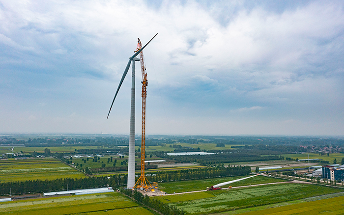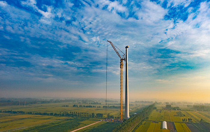 郯城風場此次吊裝的風機創下區域高度紀錄,采用140米混塔+45 米鋼塔結構,葉輪直徑達 220 米,僅機艙與葉輪總重就超 200 噸。185 米的高空作業,風力擾動、部件對接精度等因素對吊裝設備的性能提出了極致考驗,毫厘之差便可能影響整座風場的并網進度。