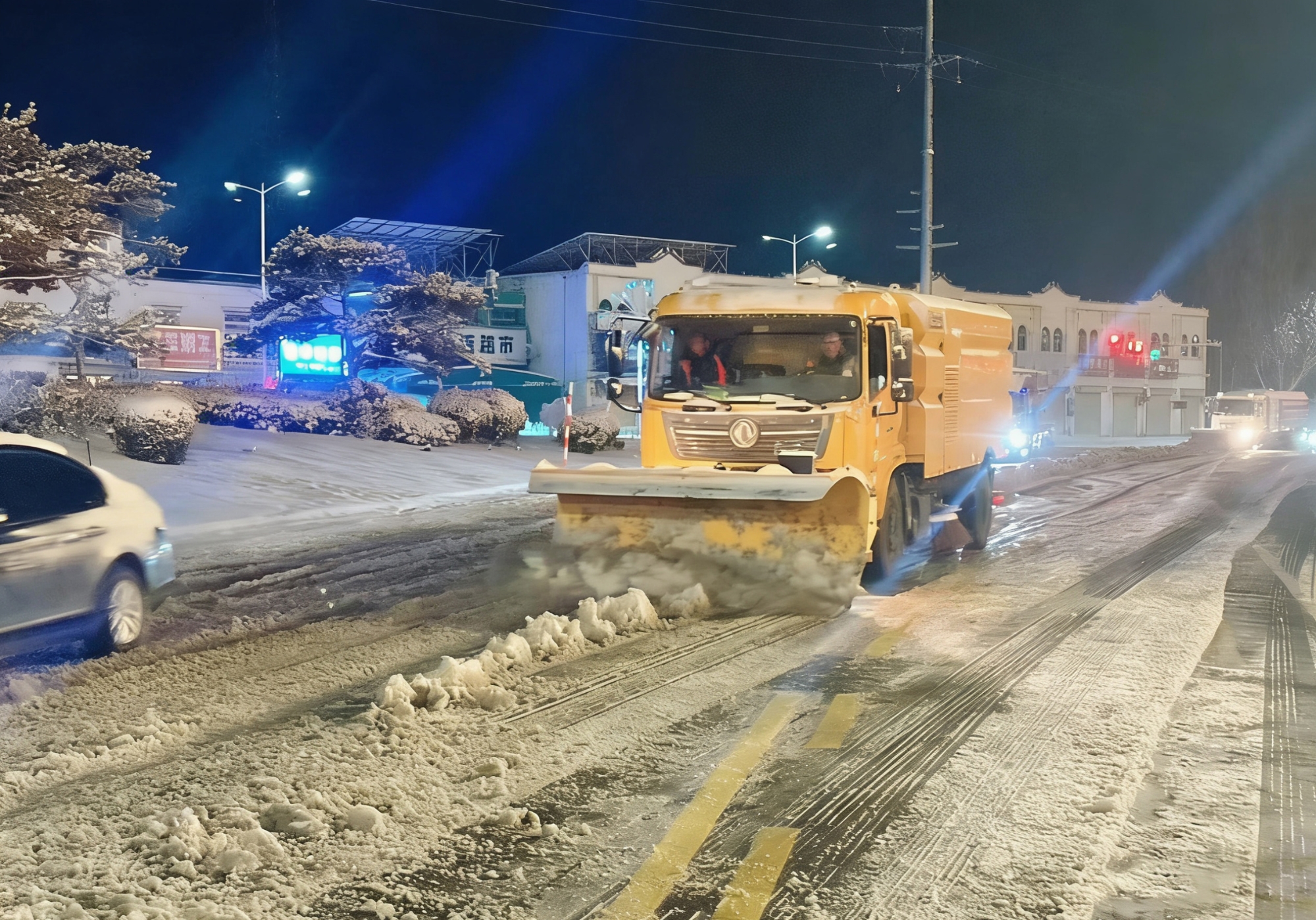 自當日中午起,徐工除雪設備投入連續(xù)作戰(zhàn)——掃路機前置雪鏟,三組司機輪班值守,人歇機不歇,從正午頂風除雪,到深夜低溫中破冰前行,直至次日凌晨6點仍堅守崗位。