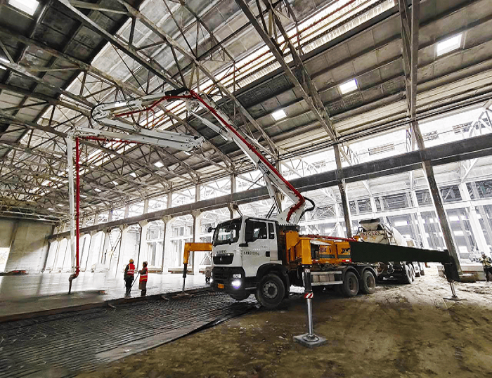 HB43V泵車搭載五節(jié)“RZ”型折疊布料桿,370°靈活旋轉(zhuǎn)無施工死角,憑借高效泵送能力適配大面積地坪連續(xù)澆筑需求,精準(zhǔn)滿足C30混凝土強(qiáng)度與平整度標(biāo)準(zhǔn)。