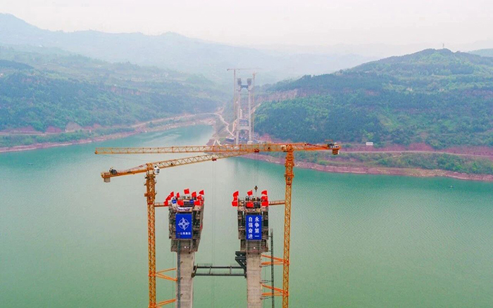 作為國內山區首座PPP模式下實施全生命周期BIM+技術的千米級特大橋,高度為177.5米的鋼筋混凝土主塔,相當于60層樓的高度,矗立于長江兩側。晴雨莫測、地勢復雜、施工高度高、晝夜施工不間斷作業……一系列復雜的施工條件,其施工難度不言而喻,對于塔機的各項性能都是極大的考驗。