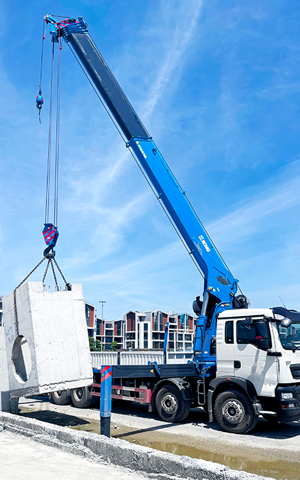 夜間設備檢修場景,工作燈自動亮起照亮作業區域。自動收鉤裝置省去繁瑣準備步驟,吊鉤穩穩固定不晃動;雙回轉減速機自鎖性能出色,吊臂懸停精準,微動作控制讓精密部件平穩就位。雙側爬梯方便操作員快速上下設備,點熄火功能一鍵啟停,大幅縮短作業間隙,助力檢修高效收尾。