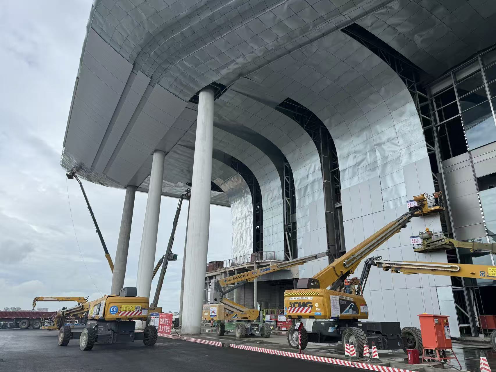 而在站房外圍,立面幕墻施工正面臨另一重考驗。異形鋁板的高精度安裝,要求設備必須具備大范圍覆蓋與穩定的高空輸送能力。徐工大米級直臂車以超強的舉升能力和長臂架延展性,成為幕墻安裝的“主力軍”。即使在高空強風環境下,智能臂架控制系統依然能保證作業平臺穩固,讓工人能從容完成定位、校準與固定。其高效的轉場能力,更使得設備在長達數百米的作業面上快速調配,大幅縮短了工期。