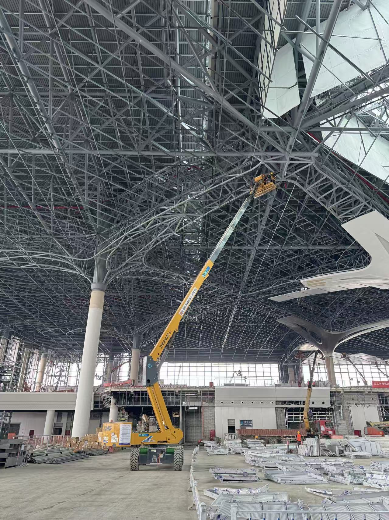 步入站房內部,抬頭仰望,巨大的穹頂鋼結構如編織的“榕樹”根系交錯延伸,施工難度極高。面對最高處近30米的作業高度,徐工30米級電動直臂車展現了其“進得去、站得穩、伸得準”的硬核實力。設備采用緊湊設計與精準操控系統,在站內狹長的通道和密集的臨時支撐架間靈活穿行,憑借平穩的臂架伸縮與微動性能,施工人員得以在籃筐內如履平地,精準完成高空焊接、螺栓緊固及防火涂料噴涂。