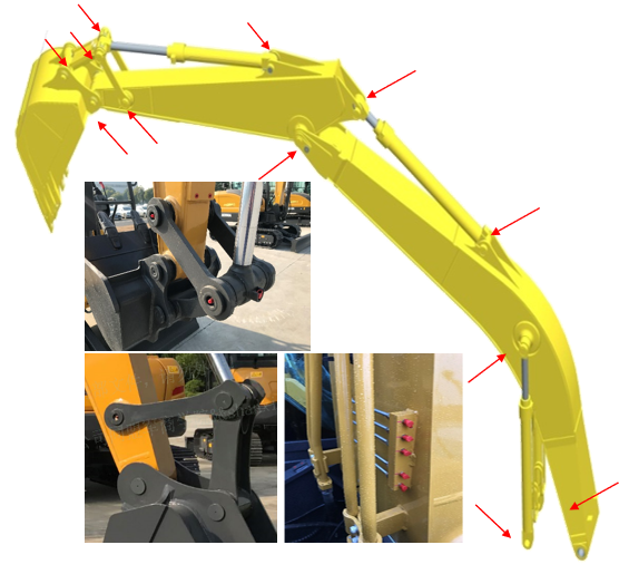 2.工作裝置的擺放姿態,隨潤滑點不同而調整,方便潤滑脂加注的操作。